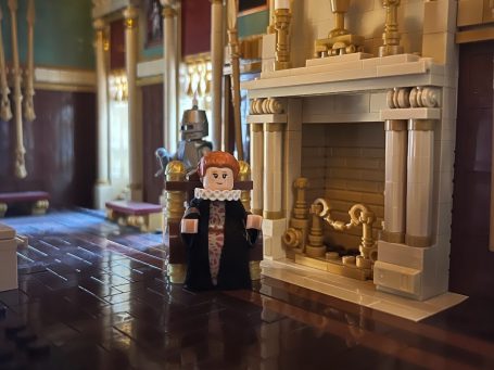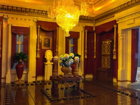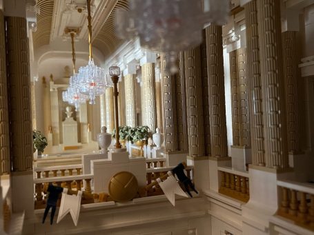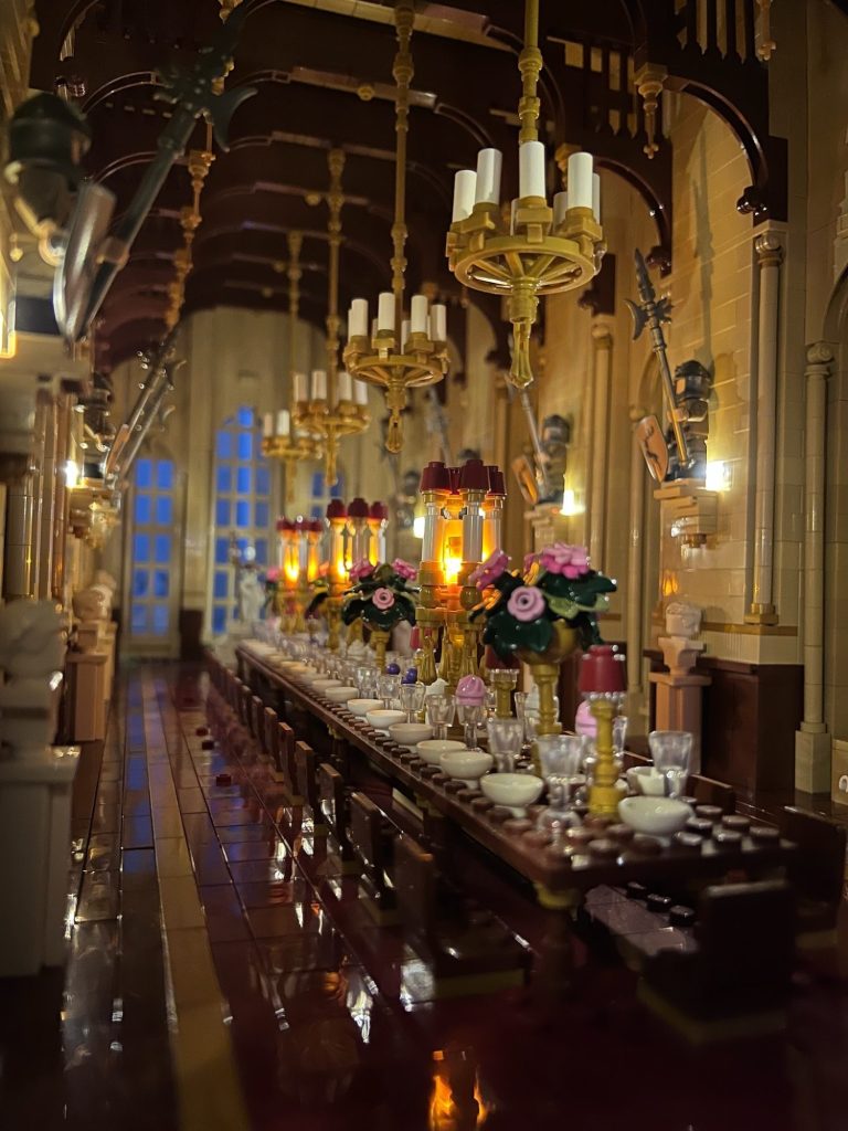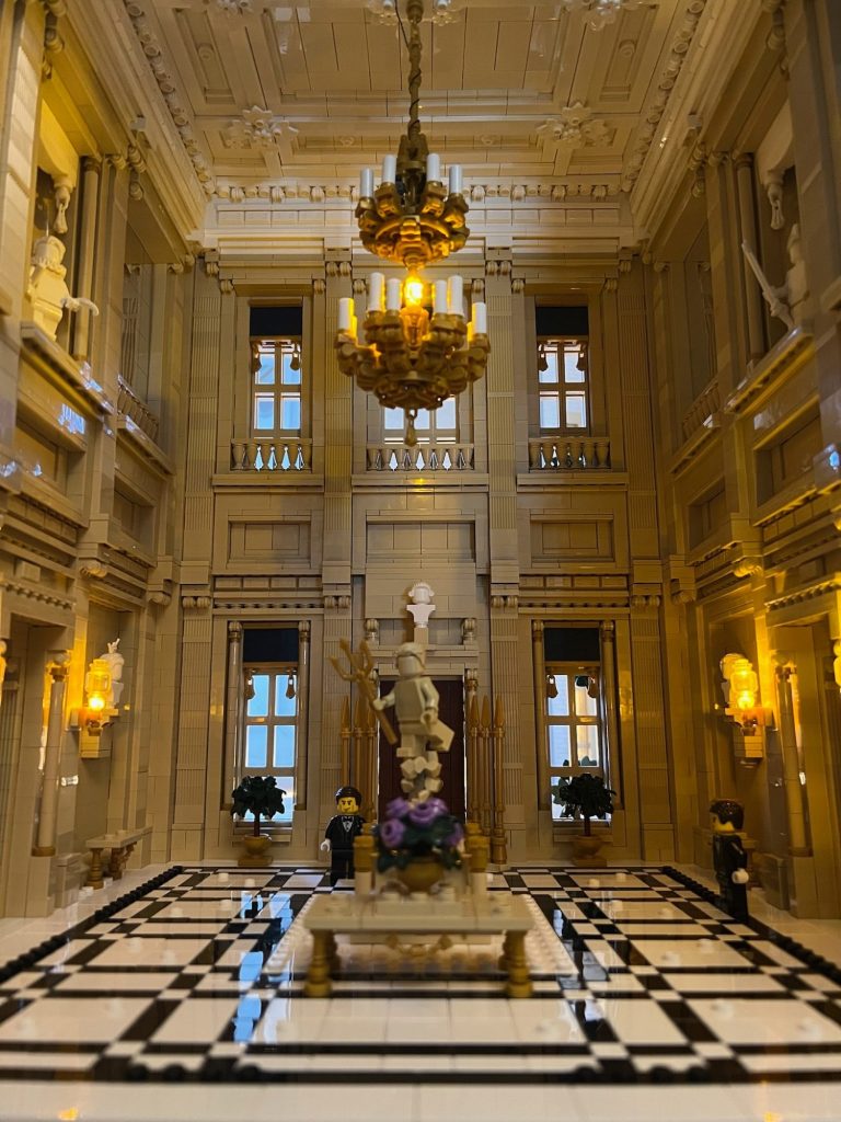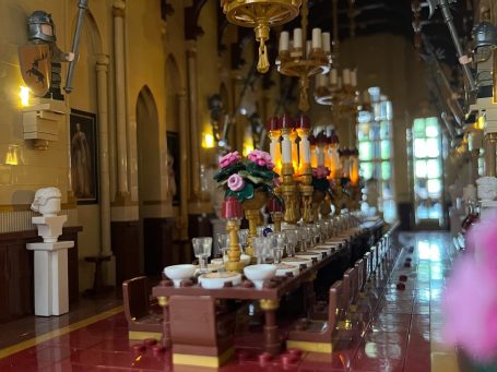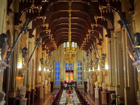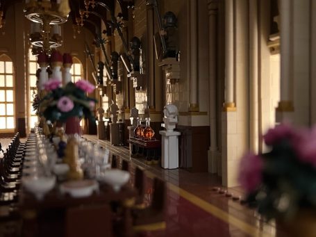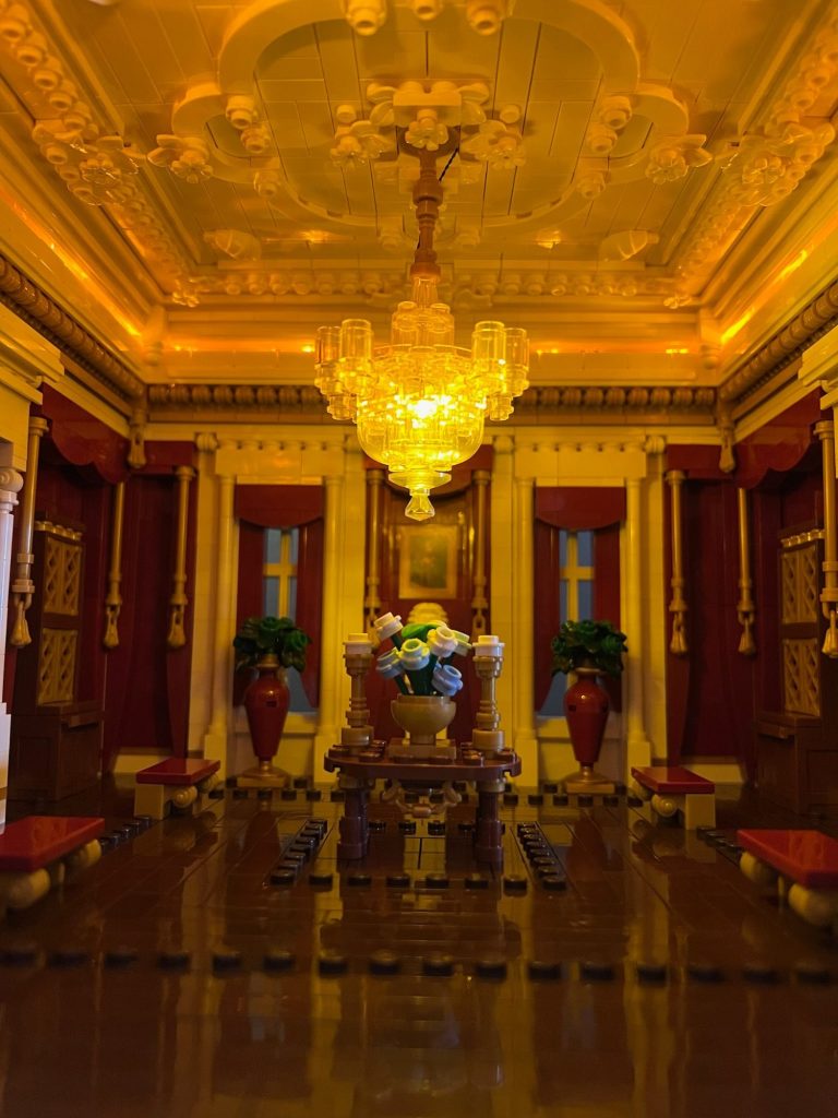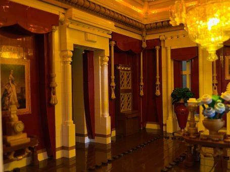 In the middle there is a very large red carpet, specially made for the hall. The room is being prepared for a banquet. You can see the level of detail and luxury.
